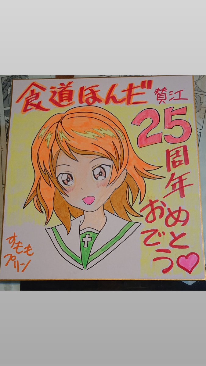 お題「フリー」 エアあんこうに行けなくて残念! 食道ほんださんの25周年を記念して色紙を描きました。ほんださんの好きな河西さんを描いてみました。 四コマ漫画も河西さん。 #週末ガルパンお絵描き120分一本勝負20211113 #ガルパン四コマ漫画 #週末ガルパンお絵描き120分一本勝負 #いつもの食堂