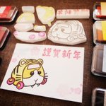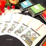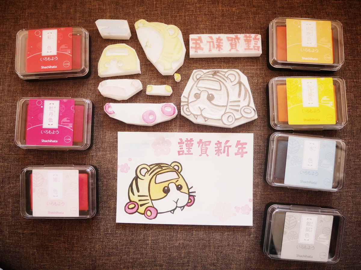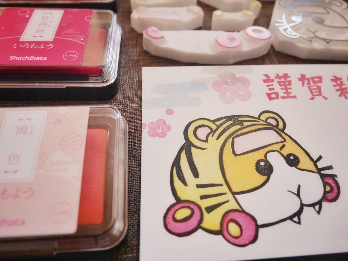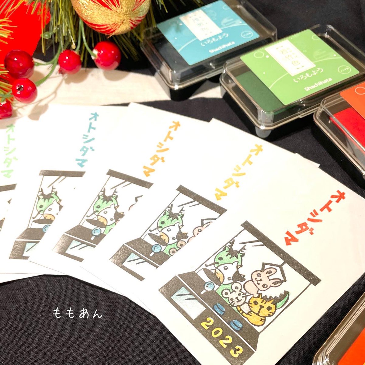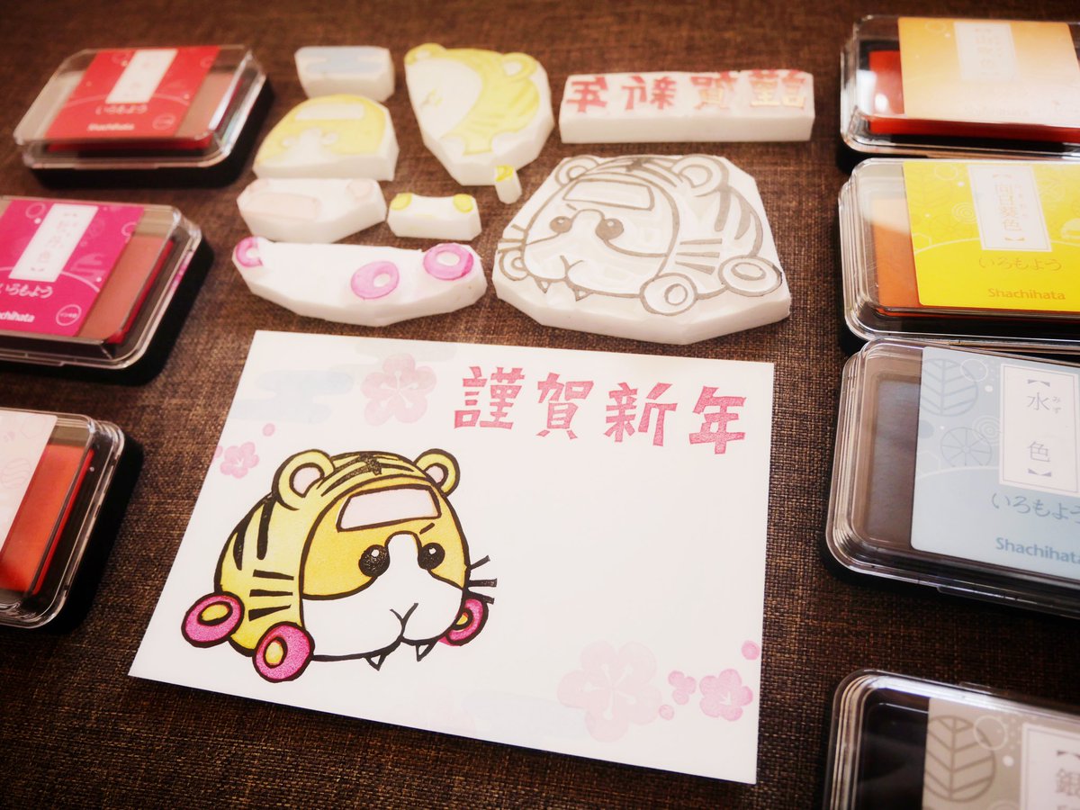今年の年賀状。 ポテトのはんこで多色🍟 #モルカーファンアート #PUIPUIモルカー #消しゴムはんこ #多色はんこ インクは #シャチハタ さんの #いろもよう に毎年お世話になっています💕