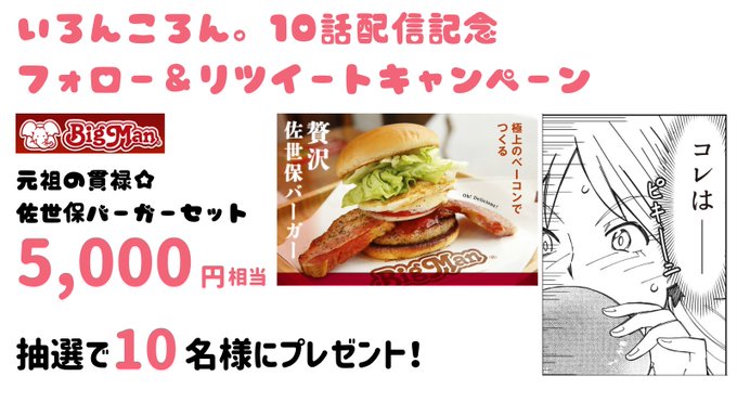 #いろんころん 10話配信記念 #ビッグマン #佐世保バーガー セット🍔を10名様にプレゼント💝 【Twitter応募方法】 ❶ @micottersasebo をフォロー ❷ このツイートをリツイート 応募締切:3月7日(月)23:59 #フォローRTキャンペーン #九十九島三姫 #漫画が読めるハッシュタグ