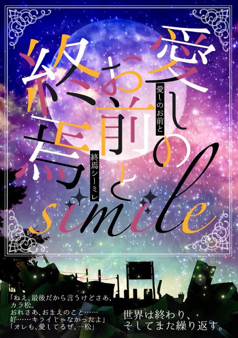 1週間ほど公開します。「愛しのお前と終焉simile【完全版】」期間限定、カラ松と一松の恋の話。カラ松は世界の終わりに一松に好意を伝えられたのに、再生された世界では忘れられていて…。#poipiku #いろキミアフター 本は7/24のイベントで出し、残れば通販に回します。 poipiku.com/1173796/701011…