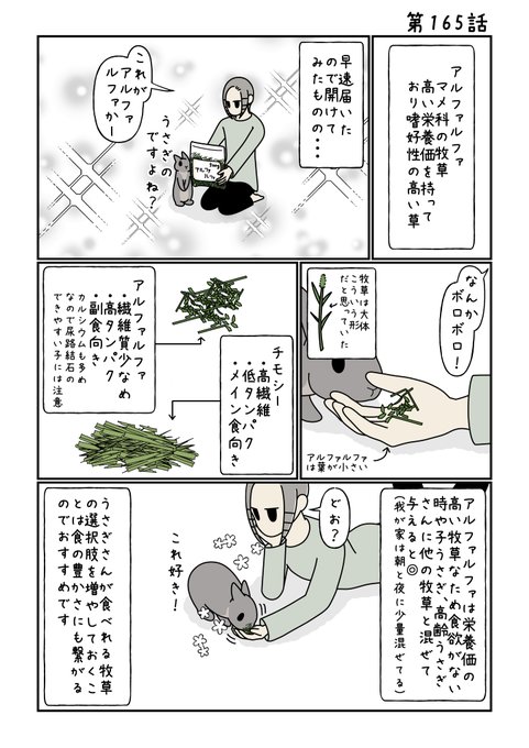 今回はアルファルファ編です☺️ 最初に見た時「葉っぱボロボロ!」と思ってたのですがそもそも葉が小さいんですね🤣 3歳のうさぎさんに与えてますが、現在は副食としておやつポジションでちょびちょびあげております☺️ #うさぎのいる暮らし #うさぎのいる生活