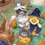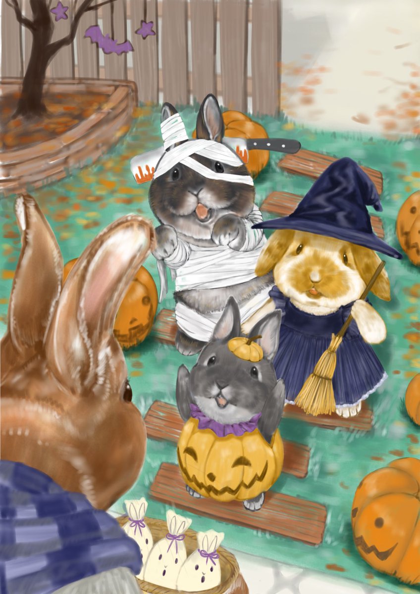 HappyHalloween!! 背景を描き込みつつキャラを引き立たせるのってどうすればいいんだろう? 背景の色をもうちょいぼかすとか?それとも影? うーん、もう少し手を入れます〜 #ハロウィンイラスト #絵描きさんと繋がりたい #イラスト好きさんと繋がりたい #うさぎ好き
