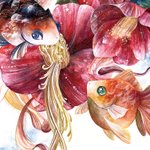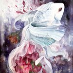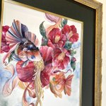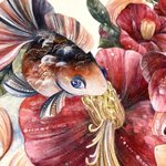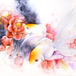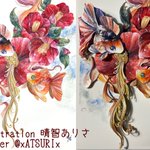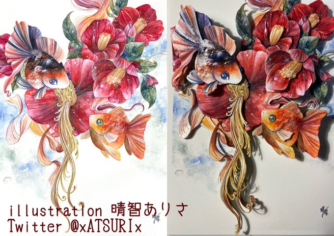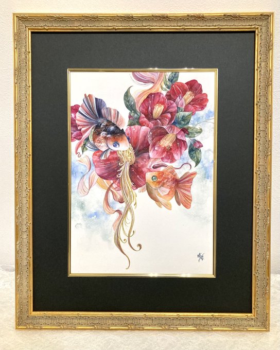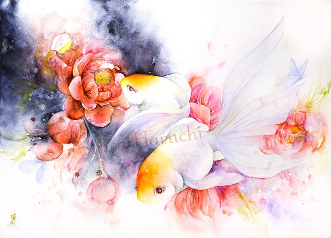 1枚目は2019年、2枚目は今年描いた牡丹と金魚です。 描いているモチーフは同じ。 生活や心に寄り添うこと、作家として生きて行くことについて見つめ直していたら変化しました。 #うたかたの色を結び