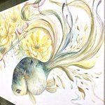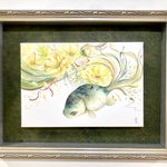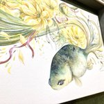 「はるやどる」 試行錯誤を重ねて新たに生まれた緑の金魚「はるやどる」を描きました。 様々な緑の混ざり合いがお気に入り。 福寿草と合わせ、喜びを表現しました。 🌱作品ページ artsoup.buyshop.jp/items/63283597 #うたかたの色を結び