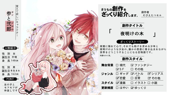 #うちの創作をざっくり紹介します テンプレお借りしました! 本編は #夜明けの木_本編 から見れますが気が向いた時や気になったとこだけ~みたいなゆるい感じで見ていただけたら嬉しいです☺ よろしくお願いします🦡