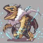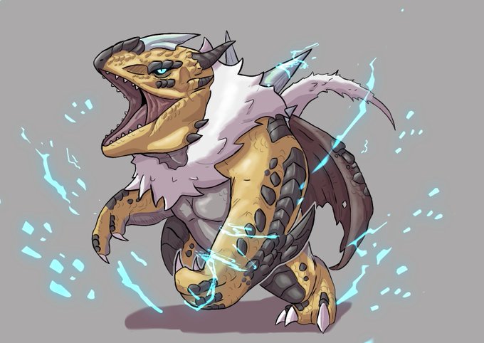 エレクト(リメイク) 体長5m 凶竜種 滅紫の洞窟に生息する中型の肉食モンスター。 頭部の角で電気を感知して獲物を探す。 体内に発電器官があり、噛まれると痺れて動けなくなってしまう。 #イラスト #うちの子モンスターバース