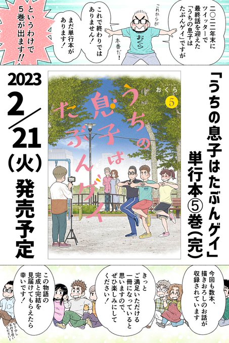 【2023年2月21日発売】 『うちの息子はたぶんゲイ』単行本⑤巻が出ます! 紙版・電子版どちらも予約が始まっています。 ☆Amazonリンク☆ 紙版 → amzn.asia/d/iDYfxz9 電子版 → amzn.asia/d/bn8mp5q 完結巻です!どうぞよろしくお願いします! #うちの息子はたぶんゲイ