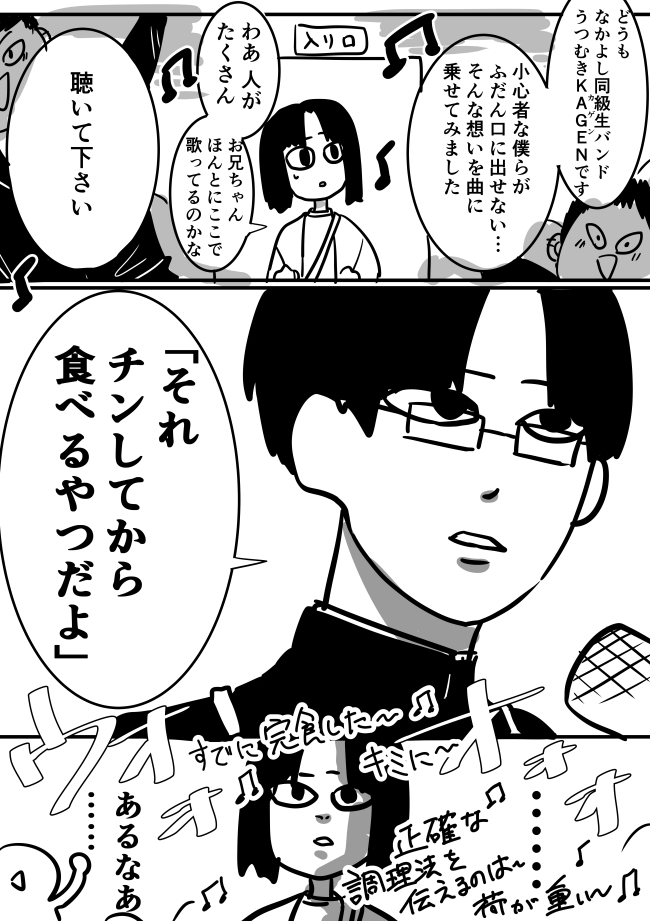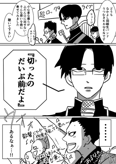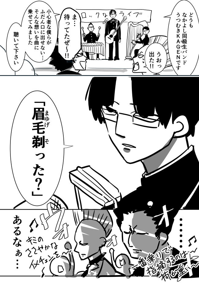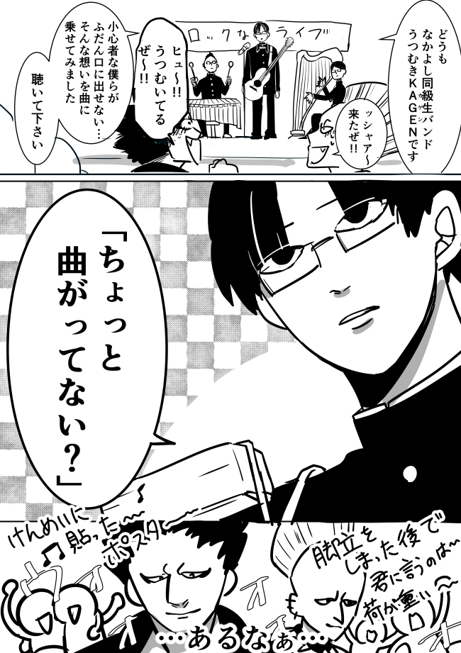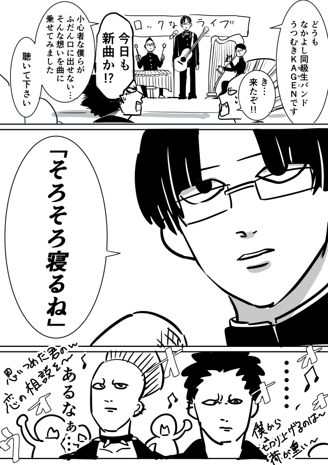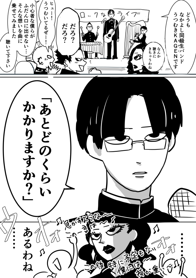 👓仲良し同級生バンド👓 🎙️🏫#うつむきKAGEN!!🎙️🏫 ボーカル、木琴、ハープの奏でる青春ソング🎧🎤 小心者な彼らが普段言えない一言を曲に乗せて歌い上げる‼️ 1曲目「やっぱり袋1枚下さい」 2曲目「ちょっと暖房暑くない?」 3曲目「その日僕もいました」 4曲目「そろそろ寝るね」 #創作漫画