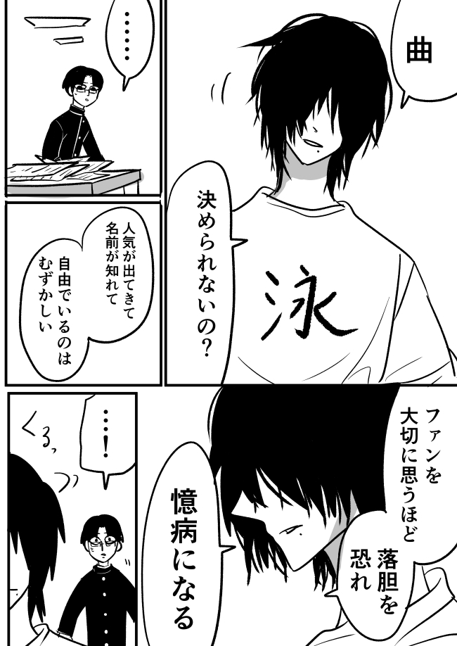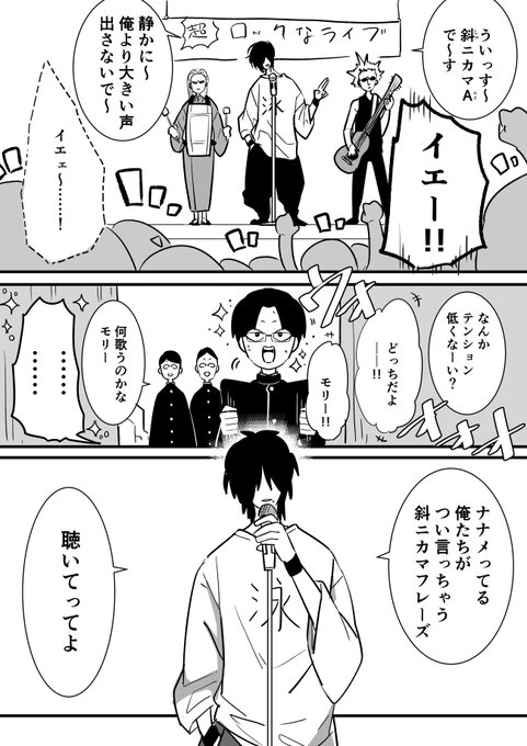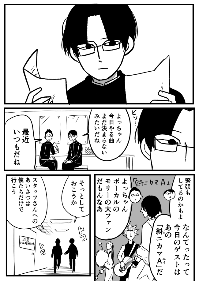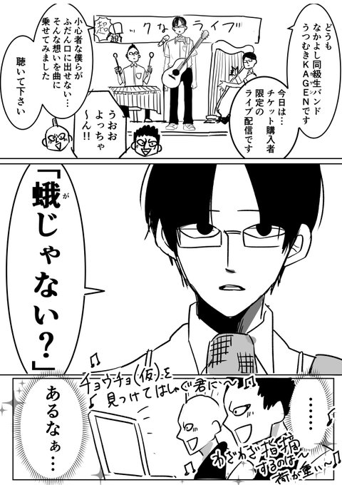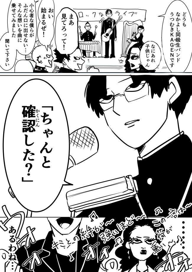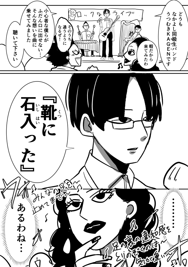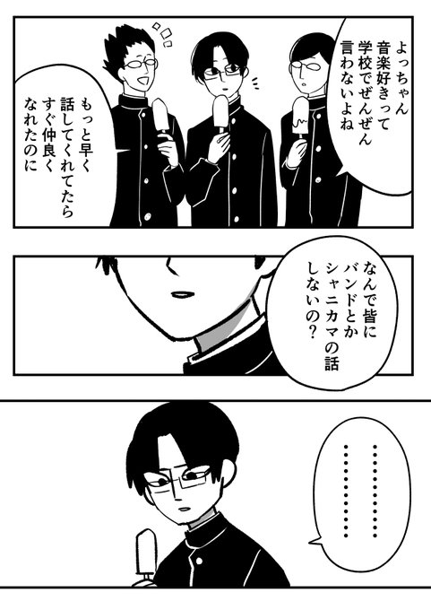 👓仲良し同級生バンド👓 🎙️🏫#うつむきKAGEN!!🎙️🏫 ボーカル、木琴、ハープの奏でる青春ソング🎧🎤 小心者な彼らが普段言えない一言を曲に乗せて歌い上げる‼️ 1曲目「やっぱり袋1枚下さい」 2曲目「ちょっと暖房暑くない?」 3曲目「その日僕もいました」 4曲目「そろそろ寝るね」 #創作漫画
