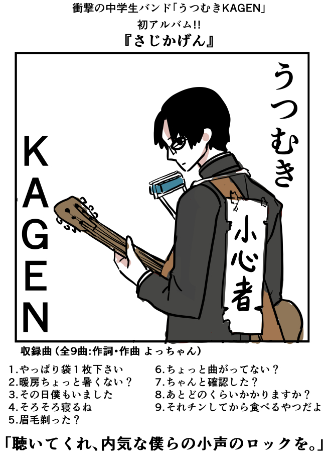 ロックバンド「#うつむきKAGEN」 聴いてくれ、内気な僕らの小声なロックを。 15曲目「靴に石入った」 16曲目「それ一回床に落ちたよ」 おまけ「薬味が苦手な友達のネギを引き受けすぎたよっちゃん」 #創作漫画