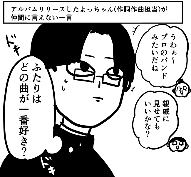 日常系ロックバンド「#うつむきKAGEN」 聴いてくれ、内気な僕らの小声なロックを。 11曲目「もうちょっとそっち寄って」 番外編「0曲目」 おまけ プライベートよっちゃん うつむきKAGENファン向けタグ→「#差し入れKAGEN」