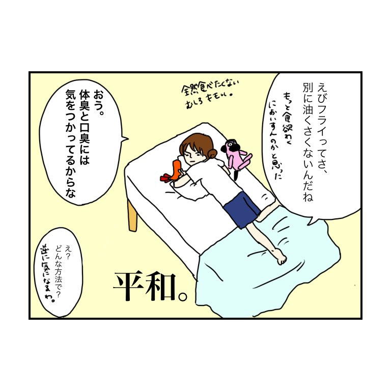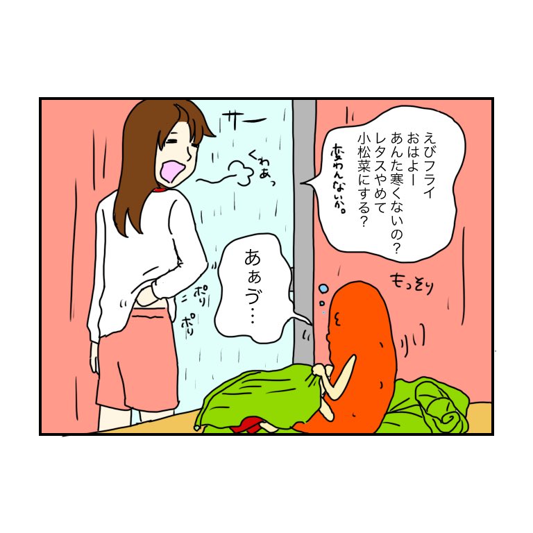 こんばんは!😉 日曜の夜、明日お仕事の人も、家事や育児を頑張ってる人も、自分と闘っている人も! みーんな楽しく元気になぁれ🙄 えびフライの日常181話、更新しました。 お暇にチラッと見てクスッとしておくれ! 久々描いたわ…w #漫画が読めるハッシュタグ #4コマ漫画 #えびフライの日常