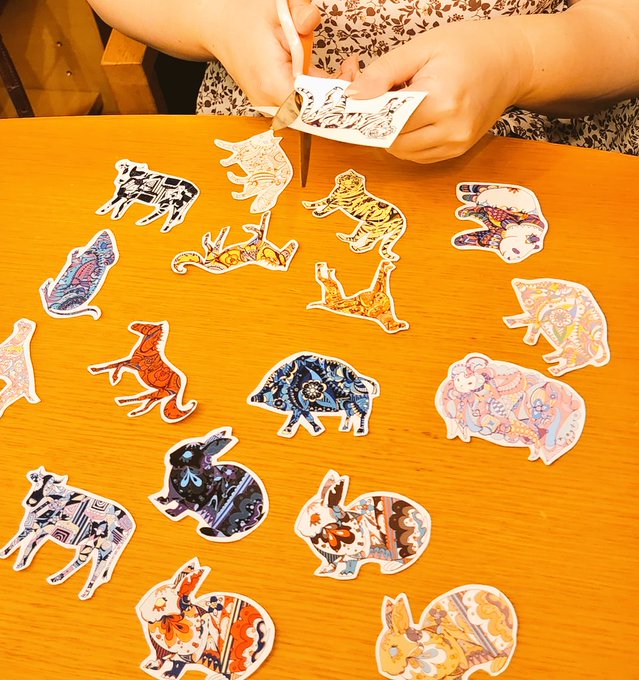 おはようございます! #えぼ展 明日からデザインフェスタギャラリー2-Aにて開幕! 京都に滞在中の鈴木りさむーんさん( @moyo_animals )からホテルでグッズ作成中の写真が届きました!果たして間に合うのか!?というか搬入までに東京に戻れるのか!?乞うご期待! #DFGHarajuku #イラスト