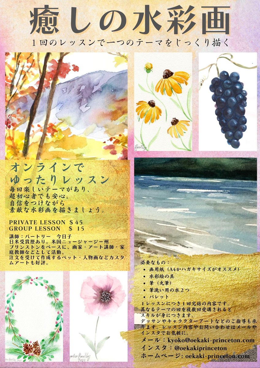 よなよなグーグルミートで行う癒しの水彩画レッスンもご興味ある方是非ご連絡ください。グループは3人以上から開催しまーす。 個人のレッスンも受け付けています。#おえかきプリンストン #キョウコのアート #kyokobartleyart twitter.com/NandaroAmerica…