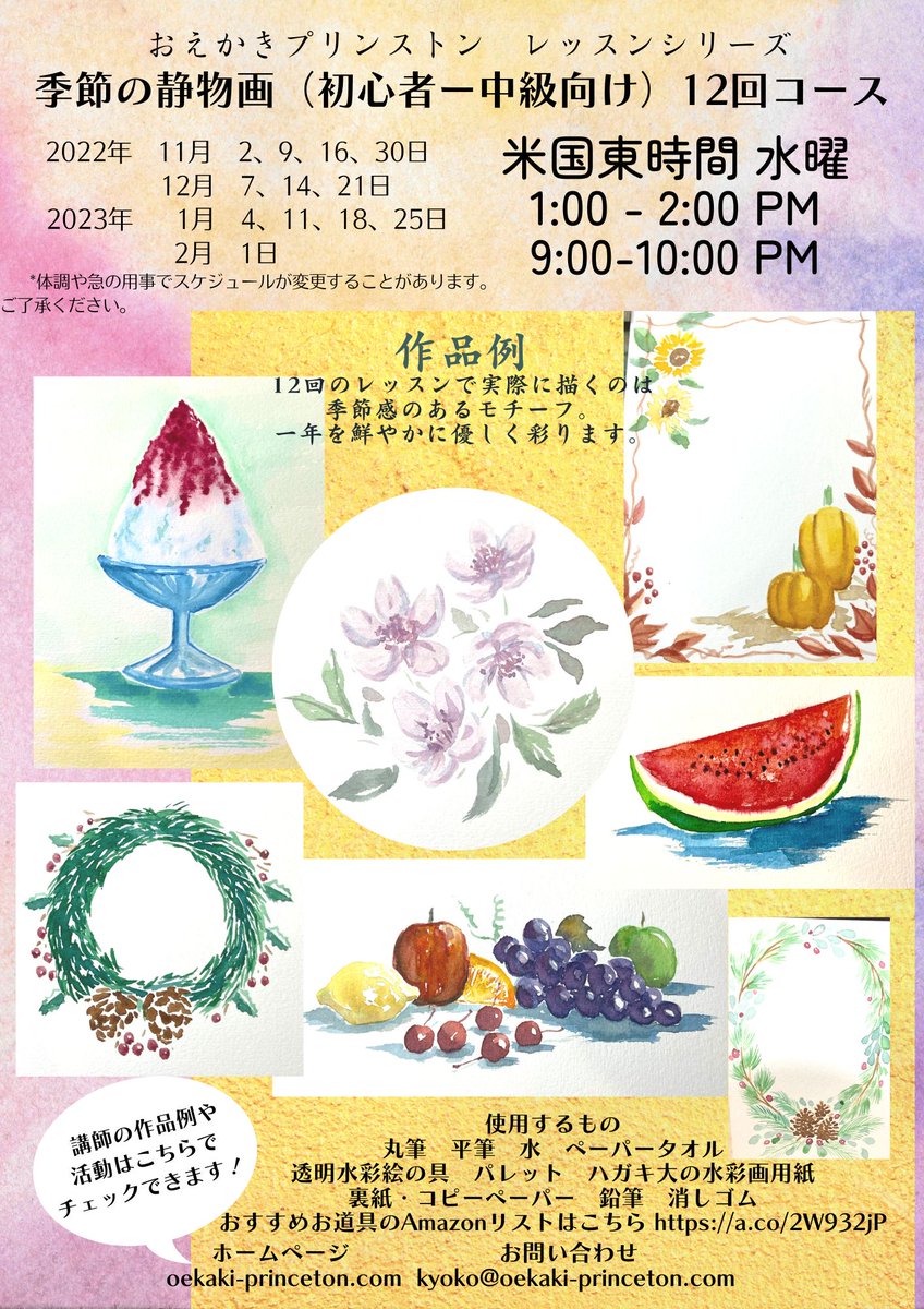 #おえかきプリンストン 🎨癒しの水彩画レッスンシリーズ 初心者ー中級者向け「季節の静物画」12回コース 11月2日水曜から開催します。🖌 おしゃべりしながら楽しく、綺麗でかわいい絵を一緒に描きませんか。🍎 丁寧にわかりやすく指導させていただきます。 詳しくは画像をみてね🖼 質問などお気軽に twitter.com/NandaroAmerica…