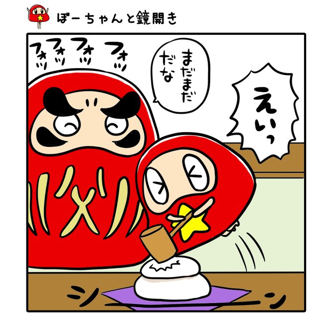 『ぼーちゃんと鏡開き🎍』 今日は鏡開き。餅を割ろうとするぼーちゃんですが…… #冬 #鏡開き #おかき #だるまのぼーちゃん #イラスト #ゆるいイラスト #ゆるかわイラスト #お絵かき #絵描きさんと繋がりたい #一日一絵 #4コマ漫画 #漫画 #漫画が読めるハッシュタグ