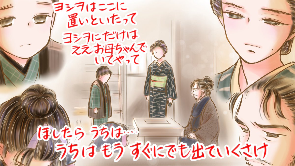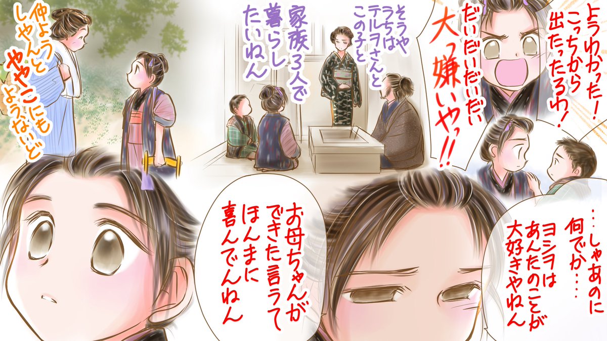 #おかわりおちょやん #おちょやん絵 第16話💕 8年ぶりに千代の前に現れたテルヲ。借金を返し終わったからヨシヲと千代と3人で暮らそう、千代の働き場所は決めてあると言ってきた。岡安で働き続けることを決めたばかりの千代は悩む。 しかし本当は…
