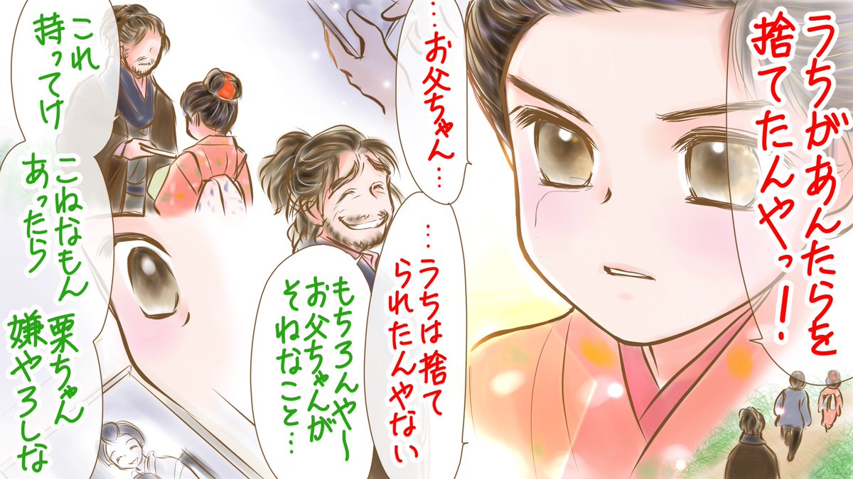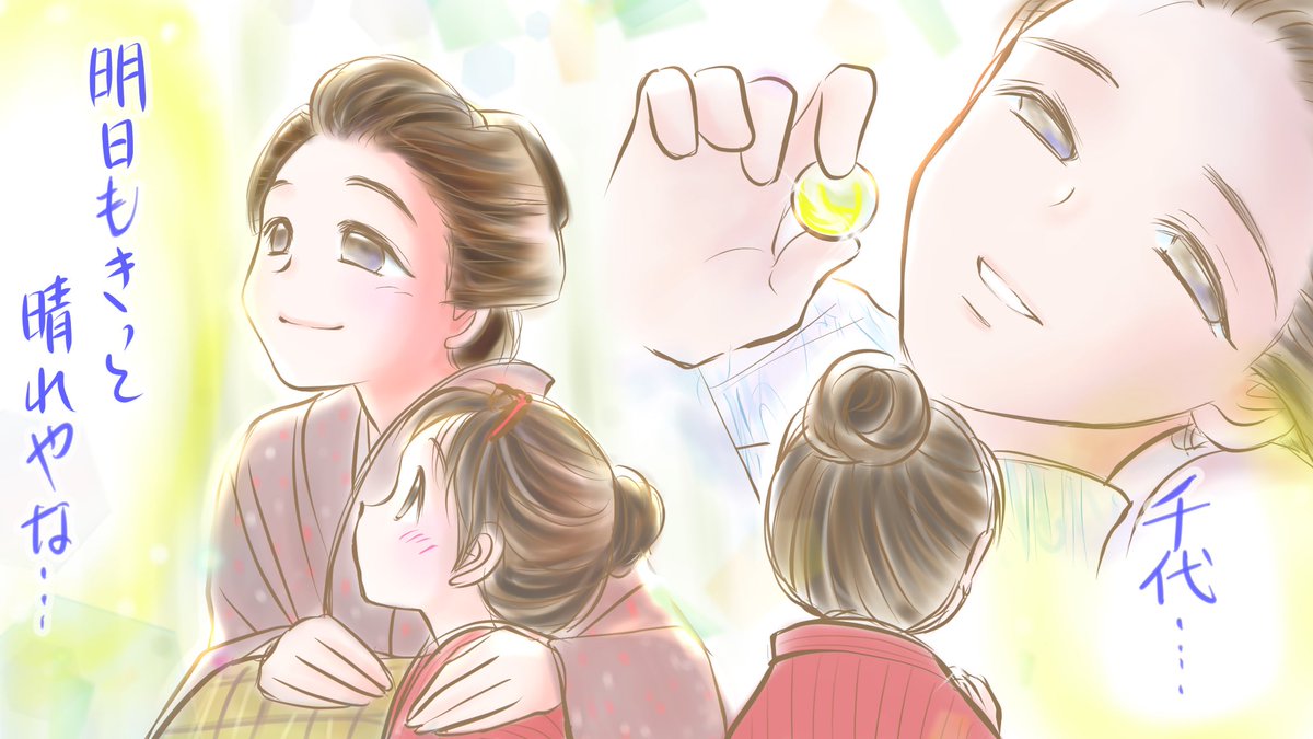 #おかわりおちょやん #おちょやん絵 第5話💕 千代は栗子のお腹に赤ちゃんがいることを知る。奉公に出すのはうちだけに…ヨシヲはここに置いたって、と懇願する。 奉公先が決まった千代は、お母ちゃん(サエ)の着物を着、髪を結ってもらい、先生やお隣にご挨拶をし、そして、2度と戻ることはなかった…