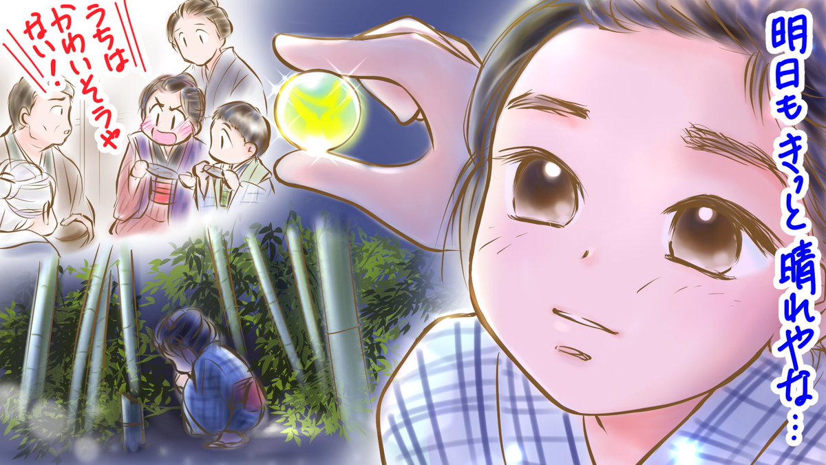 #おかわりおちょやん #おちょやん絵 第1話💕 大正5年。9歳の千代ちゃんは弟のヨシヲと飲んだくれで何もしないお父ちゃんと暮らしていました。お母ちゃんにもらった形見のガラス玉を大事に、日々を必死に生きていました。