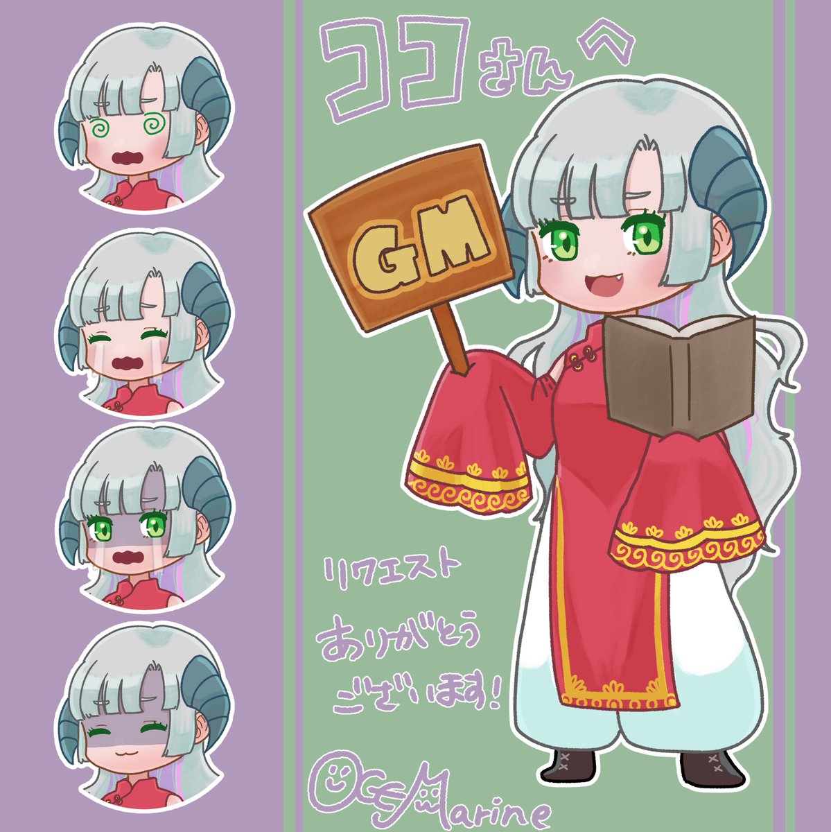 ココさんからKP立ち絵のリクエストいただきましたー!!!ありがとうございます! 本有無プラカード有無表情差分など差分もりもりつくってみましたー! アジアンテイストなお洋服ということで萌え袖に♡私の趣味全開で描きました。楽しかったですー!ありがとうございました! #おぐまりねこみっしょん