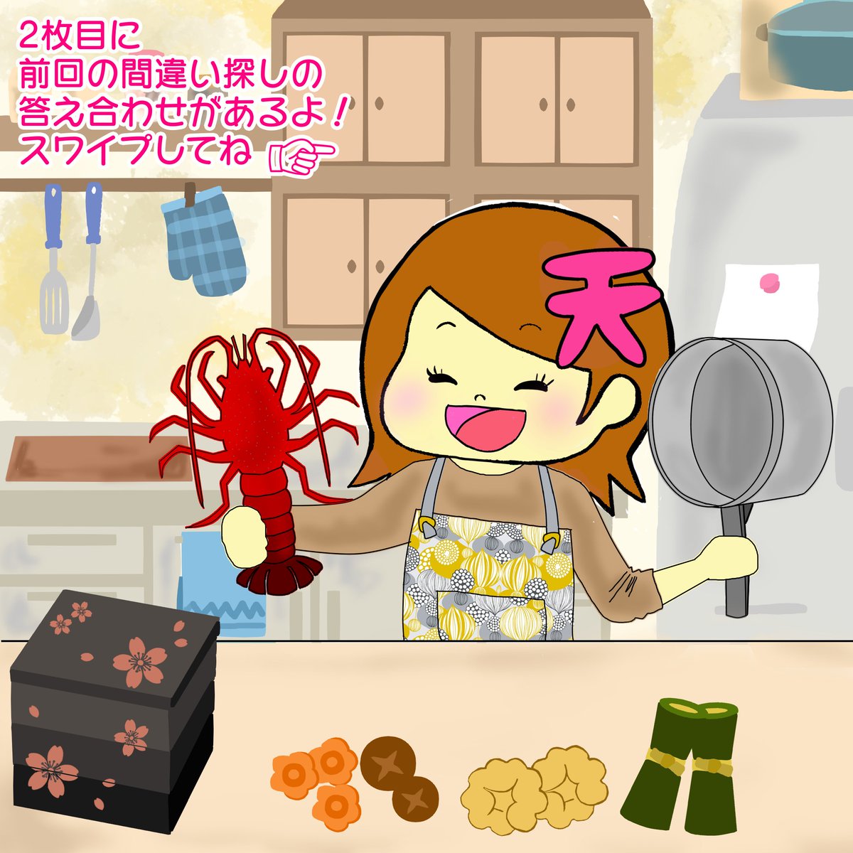 お重箱の中には何を入れようかな~😄 答え合わせ ①レンガの大きさ ②帽子の大きさ ③星の色 ④襟の形 ⑤雨の向き ⑥プレゼントの配色 みんなは全部分かったかな? #正月準備 #おせち #illustration #イラスト #イラスト好きな人と繋がりたい