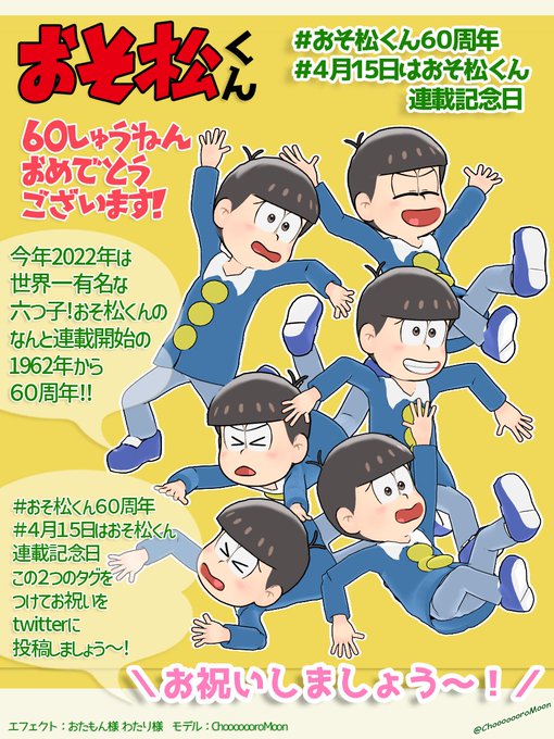 【🎉✨いよいよ来ました!60周年!🎉✨】 せっかくなので取り急ぎ2016年の公式ポーズで作ってみました😆💕 #おそ松くん60周年 #4月15日はおそ松くん連載記念日 #おそ松くん \いよいよ今年は60周年!4月15日、みんなでお祝いしましょ~!/ 詳細は画像をご覧ください💕✨