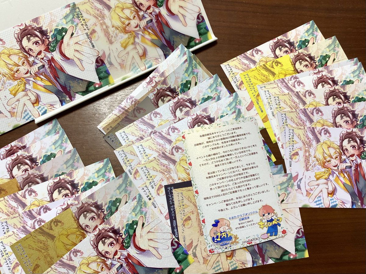 #おたクラブオリジナル印刷見本 ウワーーーーッッ!!届いた!!!! 半分透明になってるのとか、色々見比べできて楽しい😊 自分の絵柄に合う紙とか、色合いとか 参考にできたらいいな…✨イラストのサンプルもあるみたいなので、ご興味ある方は是非…! otaclub.jp/products/categ…