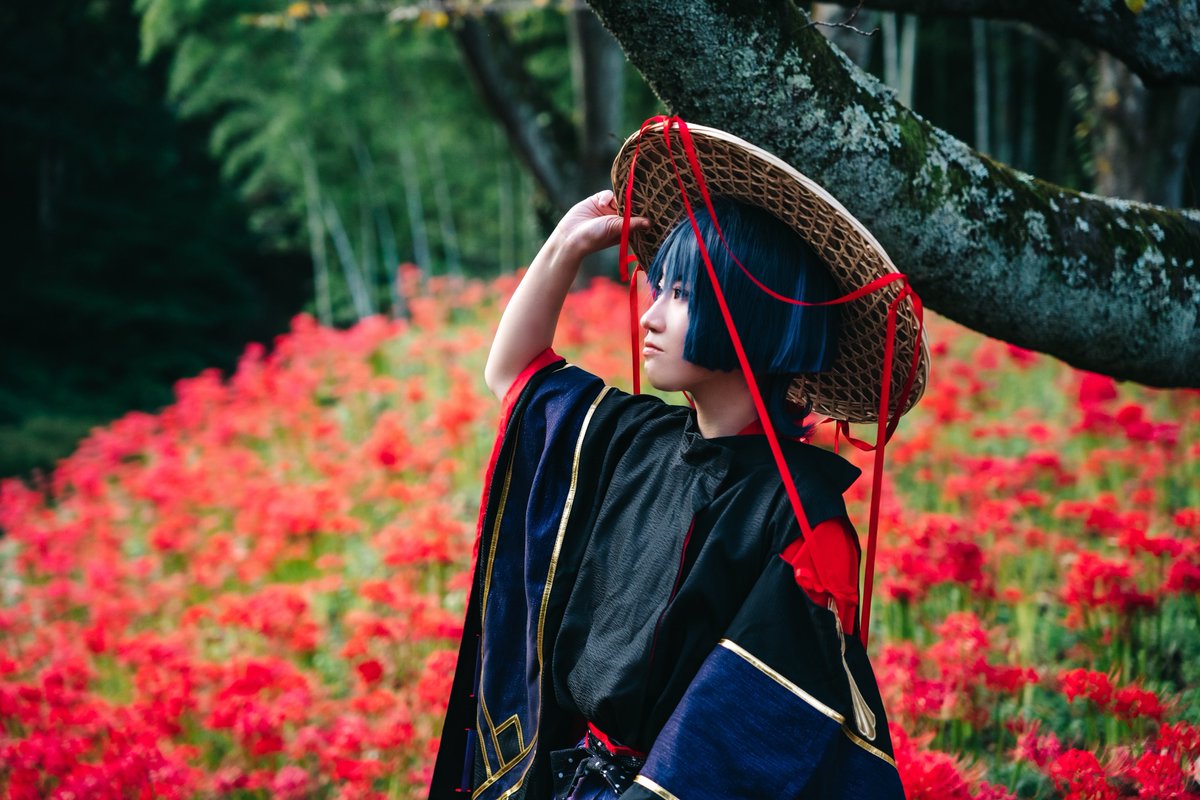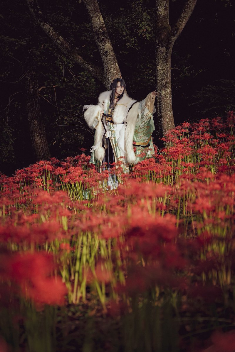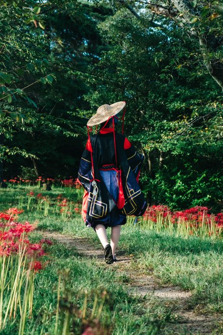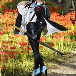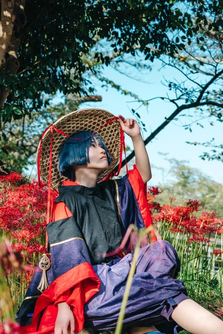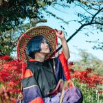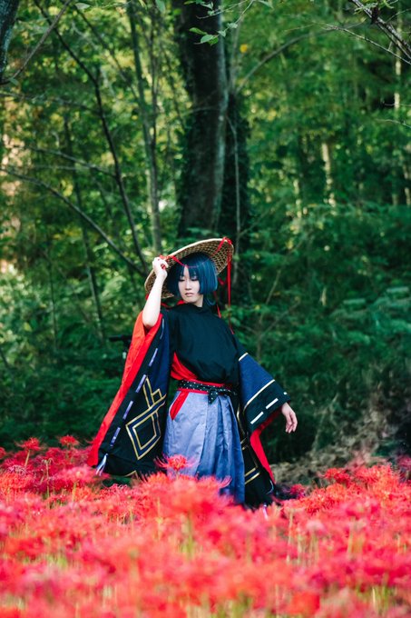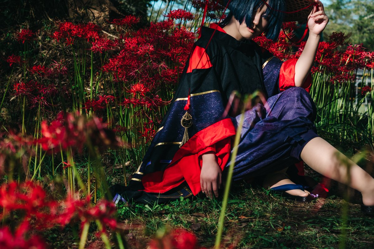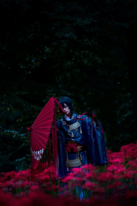 【cosplay 刀剣乱舞 三日月宗近】 4k タップ推奨 ━━━━━━━━━ 曼珠沙華 ━━━━━━━━━ photo:@S_00ayuy 様 #おでかけにくきゅう #船岡城址公園 ※被写体は通路に立ち望遠レンズにより撮影しております※