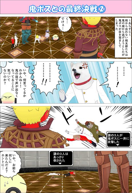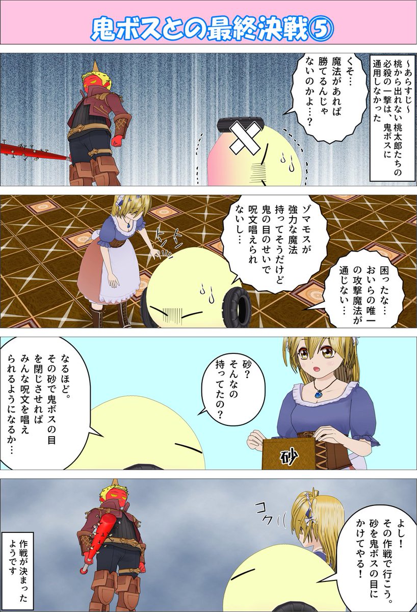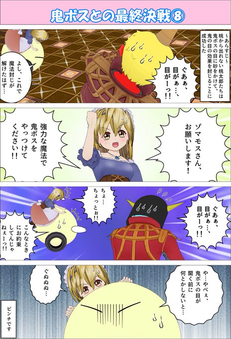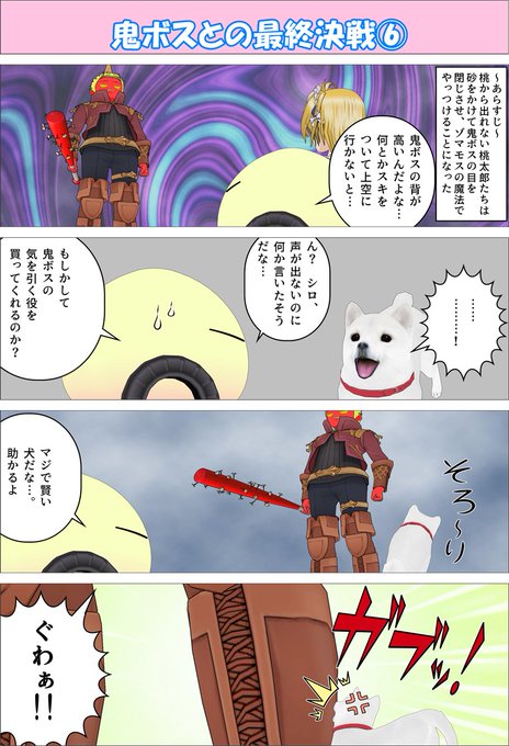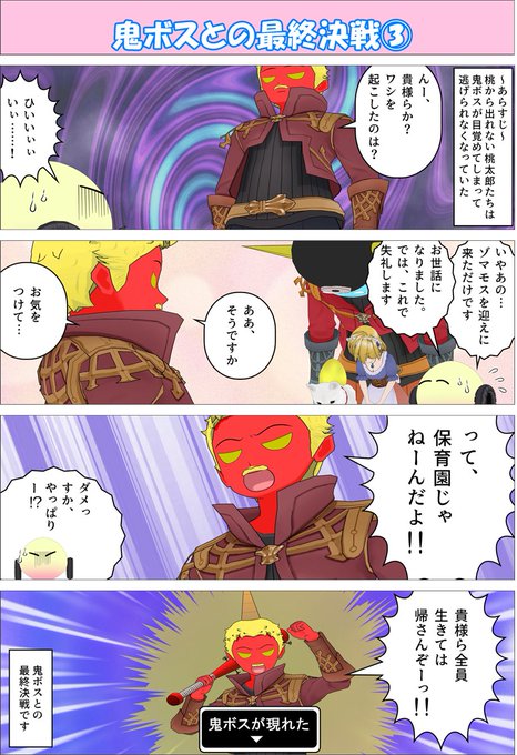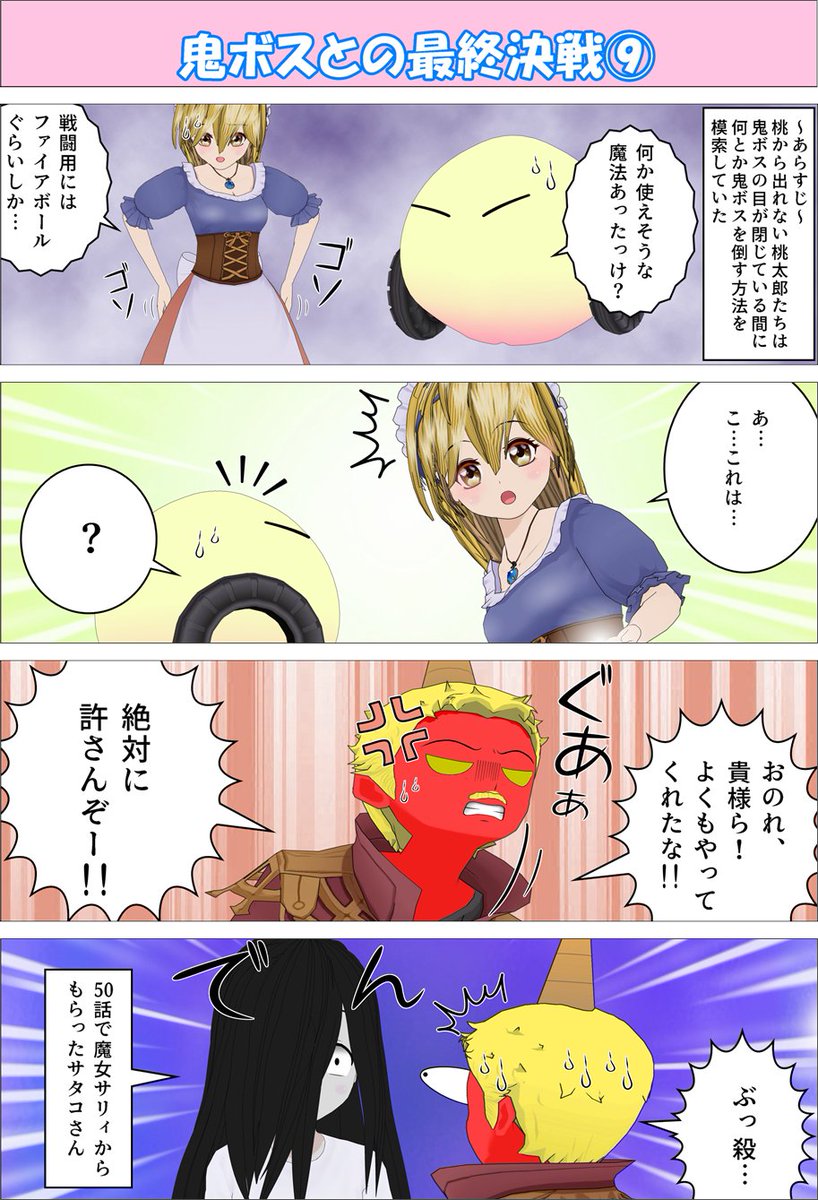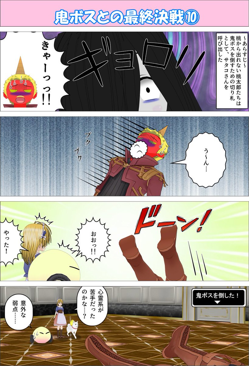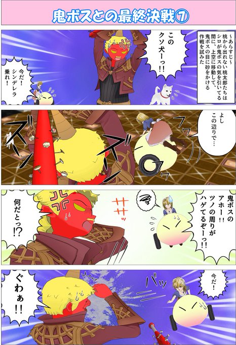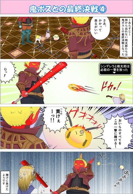 「桃から出れない桃太郎」90話。 10話分の死闘の末、ついに鬼ボスを倒した…。 #comipo #漫画 #4コマ漫画 #おとぎ話 #桃太郎 #シンデレラ #犬 #漫画が読めるハッシュタグ #漫画好きと繋がりたい #秋の創作クラスタフォロー祭り