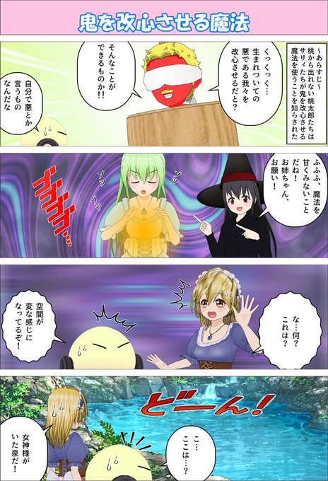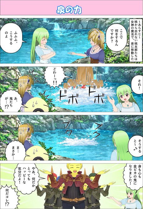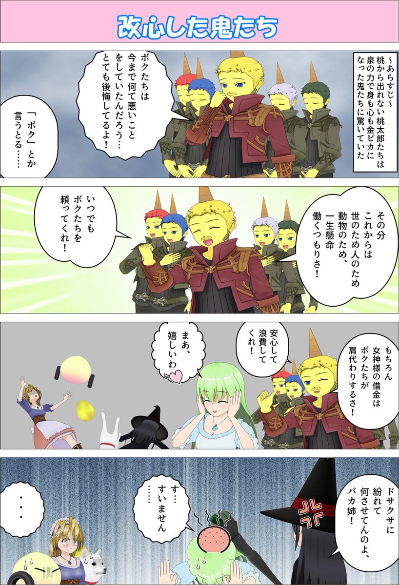 「桃から出れない桃太郎」93話。 悪者を改心、女神の泉、とくれば・・・? #comipo #漫画 #4コマ漫画 #おとぎ話 #桃太郎 #シンデレラ #犬 #漫画が読めるハッシュタグ #漫画好きと繋がりたい #秋の創作クラスタフォロー祭り