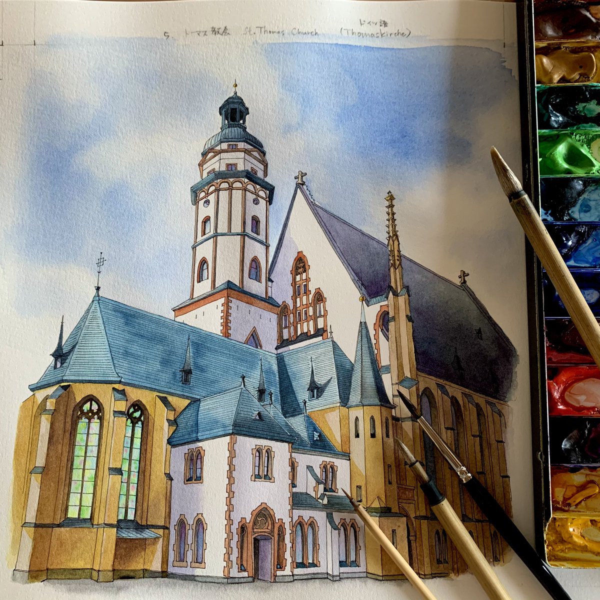 よろしかったらおうちで塗り絵でも😊. amazon.co.jp/exec/obidos/AS… 10ページ目の塗り見本です. ライプチヒのトーマス教会はバッハゆかりの教会です. #ドイツ #塗り絵 #ぬりえ #大人の塗り絵 #おとなの塗り絵 #イラスト #アナログ #絵 #水彩 #水彩画 #水彩絵を流して水彩民を増やそう #illustration