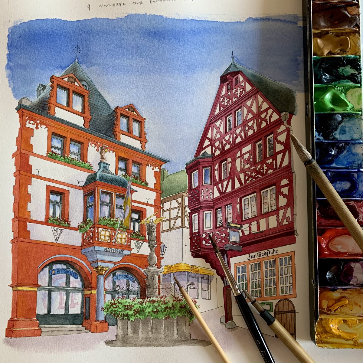 よろしかったらおうちで塗り絵でも😊. amazon.co.jp/exec/obidos/AS… 14ページ目の塗り見本です. ベルンカステル・クースの広場です. #ドイツ #塗り絵 #ぬりえ #大人の塗り絵 #おとなの塗り絵 #イラスト #アナログ #絵 #水彩 #水彩画 #水彩絵を流して水彩民を増やそう #illustration #watercolor