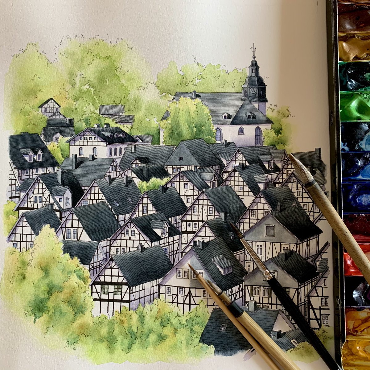 よろしかったらおうちで塗り絵でも😊. amazon.co.jp/exec/obidos/AS… 13ページ目の塗り見本です. フロイデンベルクの家並みです. #ドイツ #塗り絵 #ぬりえ #大人の塗り絵 #おとなの塗り絵 #イラスト #アナログ #絵 #水彩 #水彩画 #水彩絵を流して水彩民を増やそう #illustration #watercolor