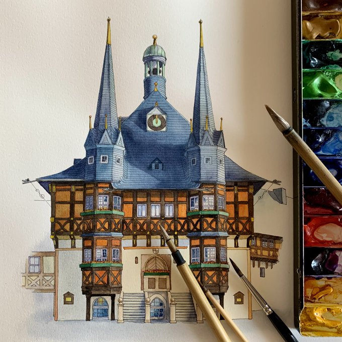 よろしかったらおうちで塗り絵でも😊. amazon.co.jp/exec/obidos/AS… 15ページ目の塗り見本です. ヴェルニゲローデ市庁舎です. #ドイツ #塗り絵 #ぬりえ #大人の塗り絵 #おとなの塗り絵 #イラスト #アナログ #絵 #水彩 #水彩画 #水彩絵を流して水彩民を増やそう #illustration #watercolor