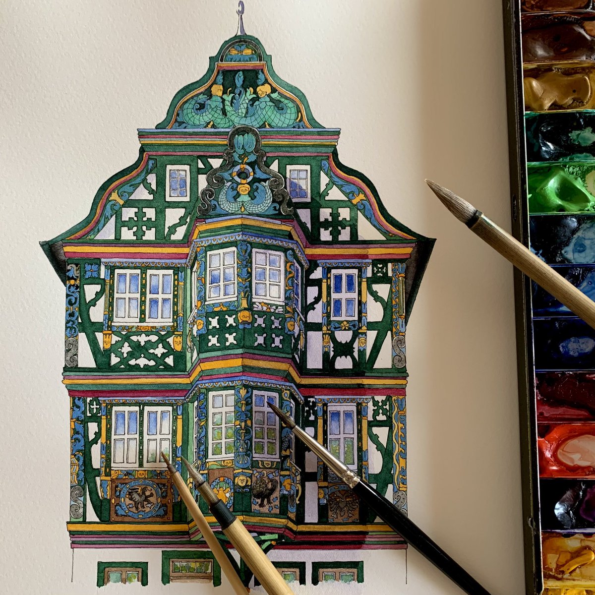 よろしかったらおうちで塗り絵でも😊. amazon.co.jp/exec/obidos/AS… 16ページ目の塗り見本です. イトシュタインのキリンガーハウスです. #ドイツ #塗り絵 #ぬりえ #大人の塗り絵 #おとなの塗り絵 #イラスト #アナログ #絵 #水彩 #水彩画 #水彩絵を流して水彩民を増やそう #illustration #watercolor