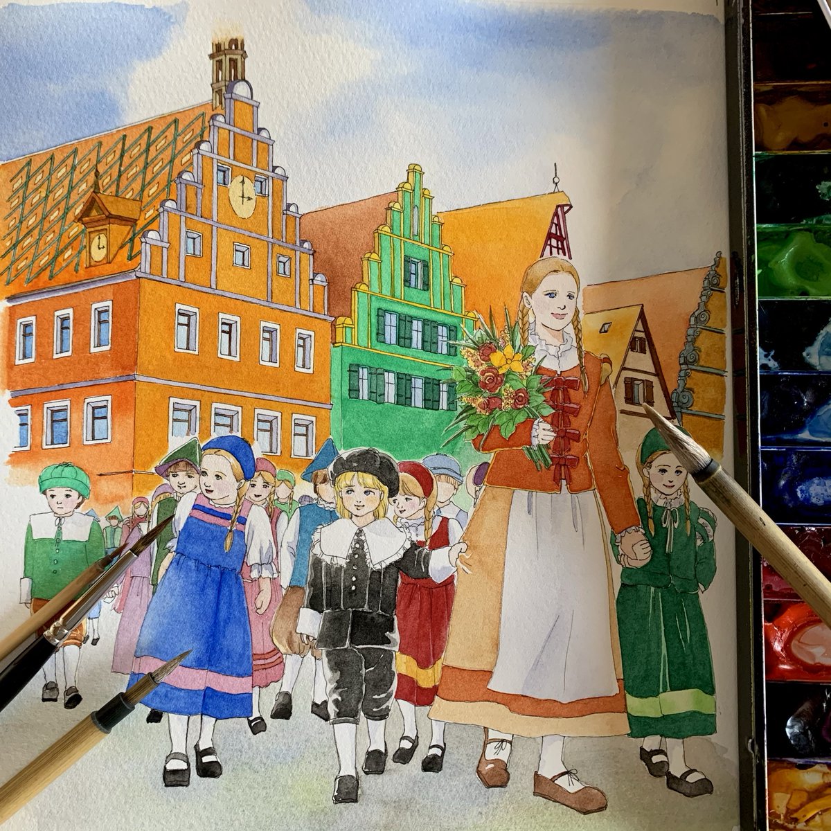 よろしかったらおうちで塗り絵でも😊. amazon.co.jp/exec/obidos/AS… 19ページ目の塗り見本です ディンケルスビュールの子ども祭りです #ドイツ #塗り絵 #ぬりえ #大人の塗り絵 #おとなの塗り絵 #イラスト #アナログ #絵 #水彩 #水彩画 #水彩絵を流して水彩民を増やそう #illustration #watercolor