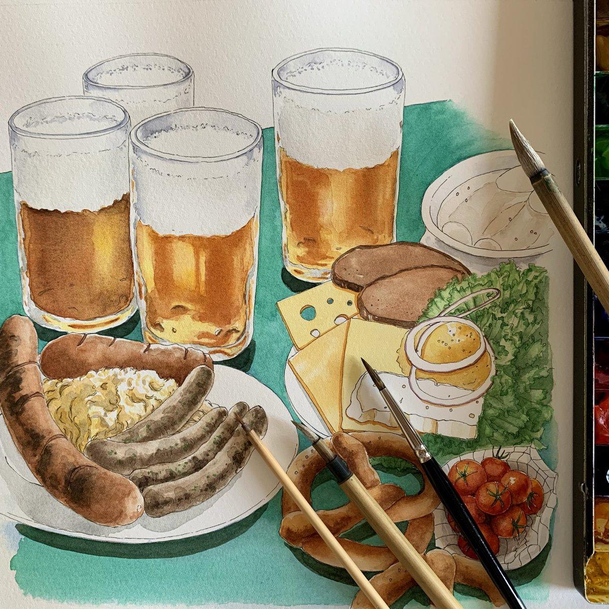 よろしかったらおうちで塗り絵でも😊 amazon.co.jp/exec/obidos/AS… 20ページ目の塗り見本です ビールとソーセージの食卓です #ドイツ #塗り絵 #ぬりえ #大人の塗り絵 #おとなの塗り絵 #イラスト #アナログ #絵 #水彩 #水彩画 #水彩絵を流して水彩民を増やそう #illustration #watercolor