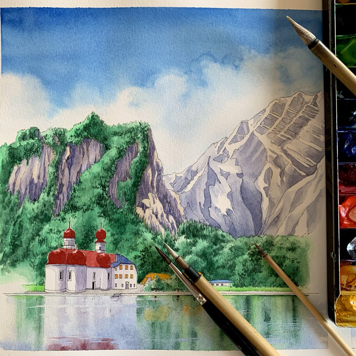 よろしかったらおうちで塗り絵でも😊 amazon.co.jp/exec/obidos/AS… 23ページの塗り見本 ベルヒテスガーデン・聖バルトロメ僧院とケーニヒス湖 #ドイツ #塗り絵 #ぬりえ #大人の塗り絵 #おとなの塗り絵 #イラスト #アナログ #絵 #水彩 #水彩画 #水彩絵を流して水彩民を増やそう #illustration #watercolor