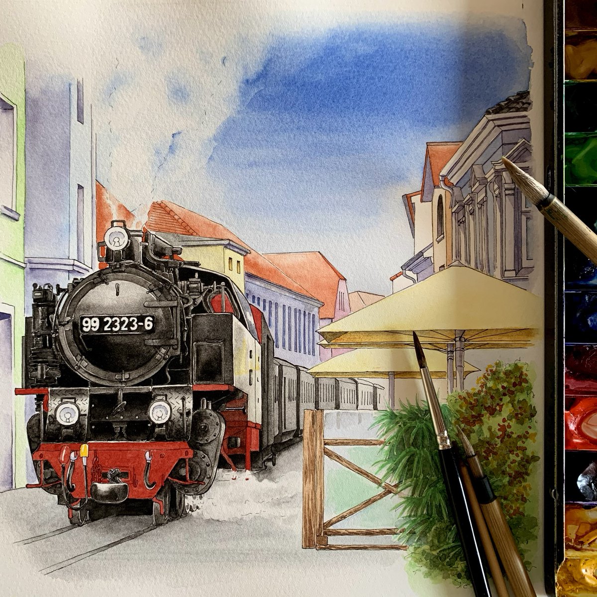 よろしかったらおうちで塗り絵でも😊. amazon.co.jp/exec/obidos/AS… 24ページ目の塗り見本です。 街中を走る蒸気機関車(モリ―鉄道)です。 #ドイツ #塗り絵 #ぬりえ #大人の塗り絵 #おとなの塗り絵 #イラスト #アナログ #絵 #水彩 #水彩画 #水彩絵を流して水彩民を増やそう #illustration #watercolor