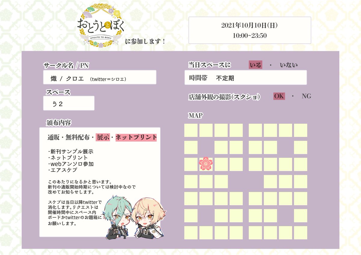 10/10「おとうととぼく」参加します。 う2 【 熾 】 新刊が当日に間に合わなかったのでサンプルを先に展示するのとネップリ、webアンソロは間に合えば…!通販関係は追ってお知らせします。エアスケブもやるつもりなのでお気軽にどうぞ。よろしくおねがいします。 #おとぼく_1010