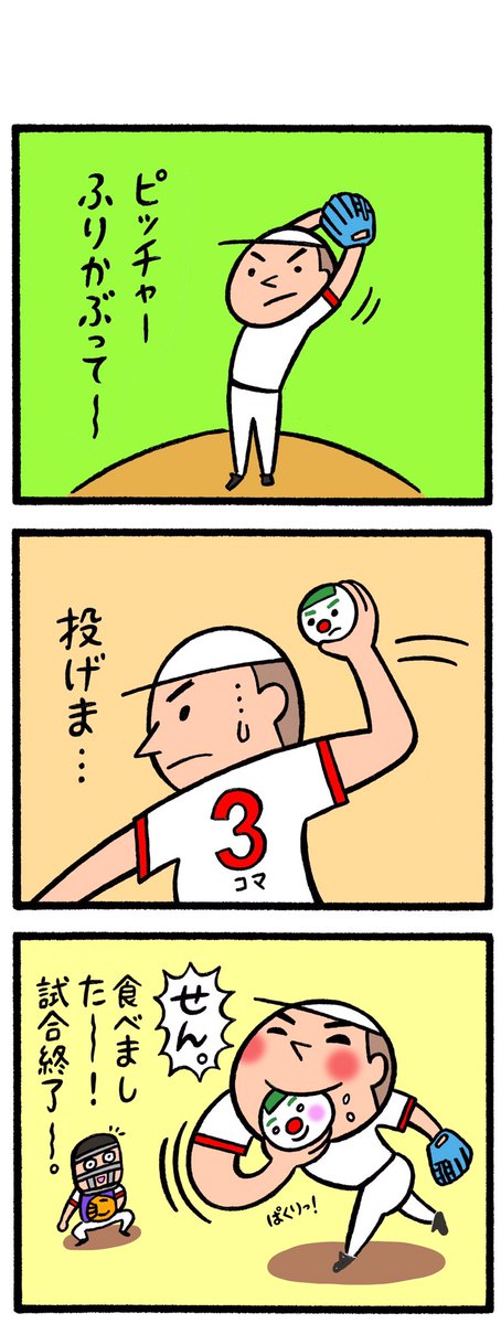 おにぎりあるある🍙 (おにぎりで野球) 「ピッチャー」 #漫画が読めるハッシュタグ #3コマ漫画 #オリキャラ #野球 #ピッチャー #おにぎりあるある #みんなで楽しむTwitter展覧会 #アトリエの系譜