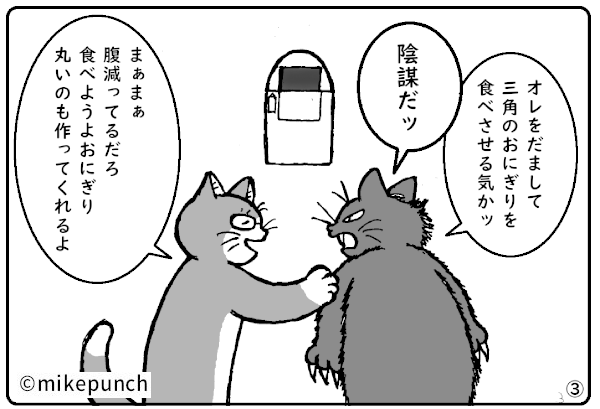 「おにぎり猫のものがたり」第二十六話 三角のおにぎり 小梅の店にやってきた二人連れ。 ひとりが「おにぎりは丸いものだ!」と ゴネますが・・・。 note.com/mikepunch/n/nc… mikepunch.net/onigirinekosta… #おにぎり猫のものがたり #漫画が読めるハッシュタグ #おにぎりの形 #気のおけない友達