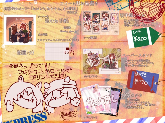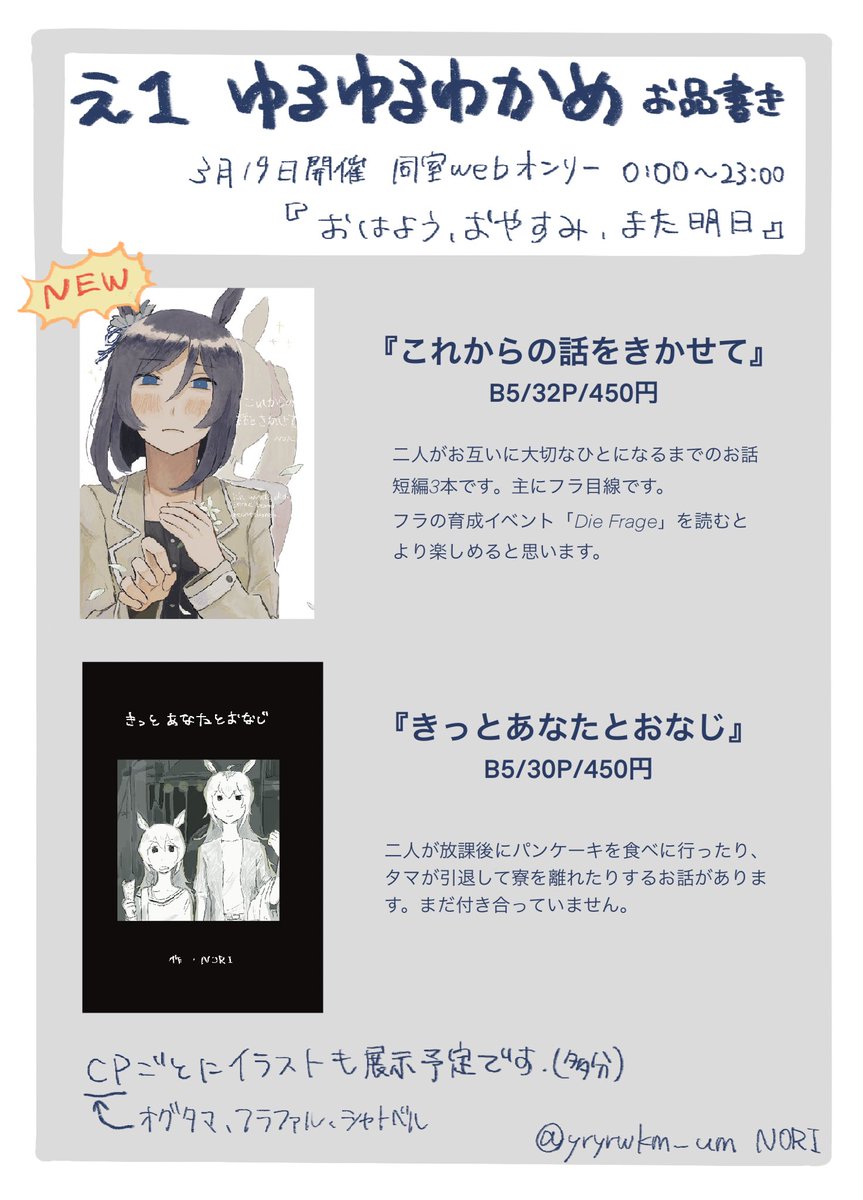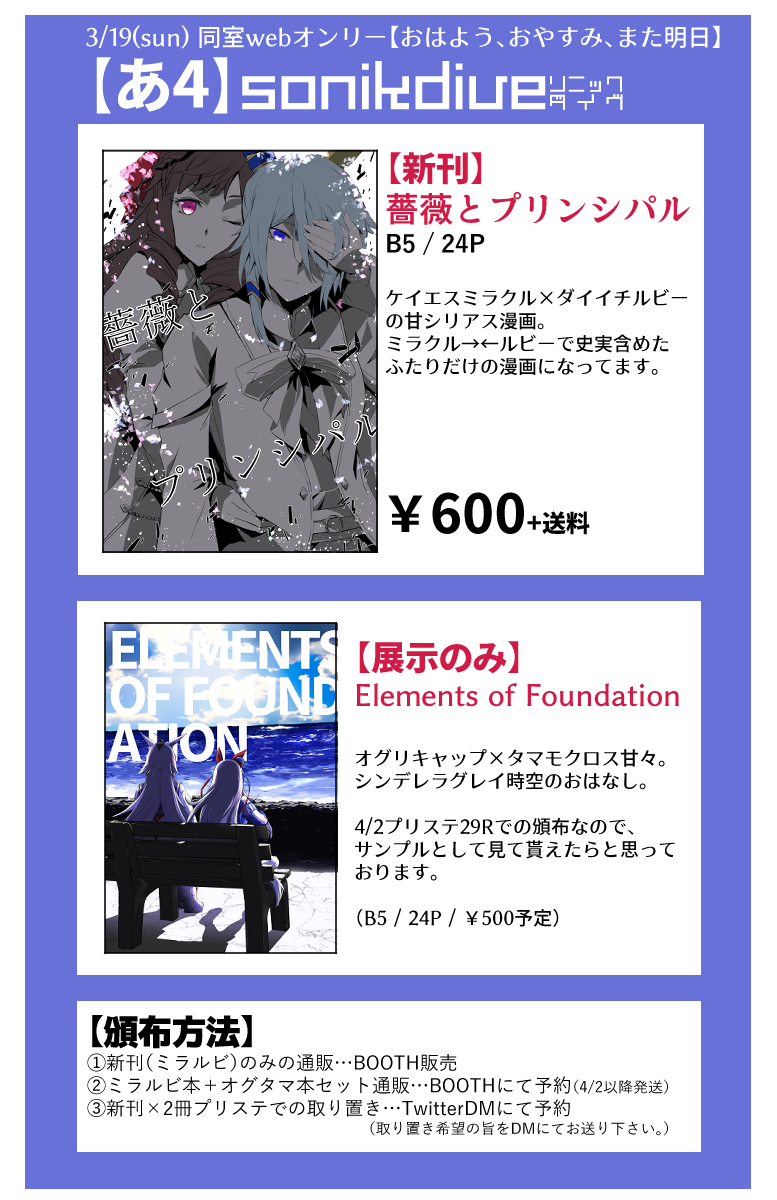 3月19日開催の同室webオンリー #おはようおやすみまた明日 の サークルカットとお品書きです!当日よろしくお願いします 本のサンプル↓ 新刊 pixiv.net/artworks/10618… 既刊 pixiv.net/artworks/99839…