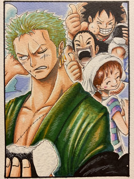 ゾロの照れ笑い というお題でした!原作から外れないラインでゾロらしく照れるとしたら…ここかなぁと🍙 #ONEPIECE #イラスト #ゾロ #アニワンはリアタイできない #おはようございます