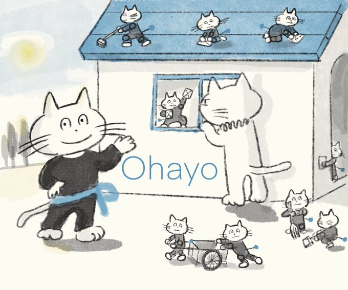 Ohayoございます 「説明しよう! 夜明けが早くなってきたので朝からネココロボたちが大そうじをしているのだ」 #おはようねここ #2月は毎日ねこの日だよね #イラスト #illustraion #みんなdeポジティブ人間化 #みんなで楽しむTwitter展覧会