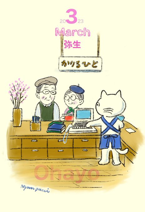 Ohayoございます 3月になりもうした (お仕事で描いた図書館業界のカレンダー) #イラスト #みんなdeポジティブ人間化 #みんなで楽しむTwitter展覧会 #3月1日でございます #おはようねここ