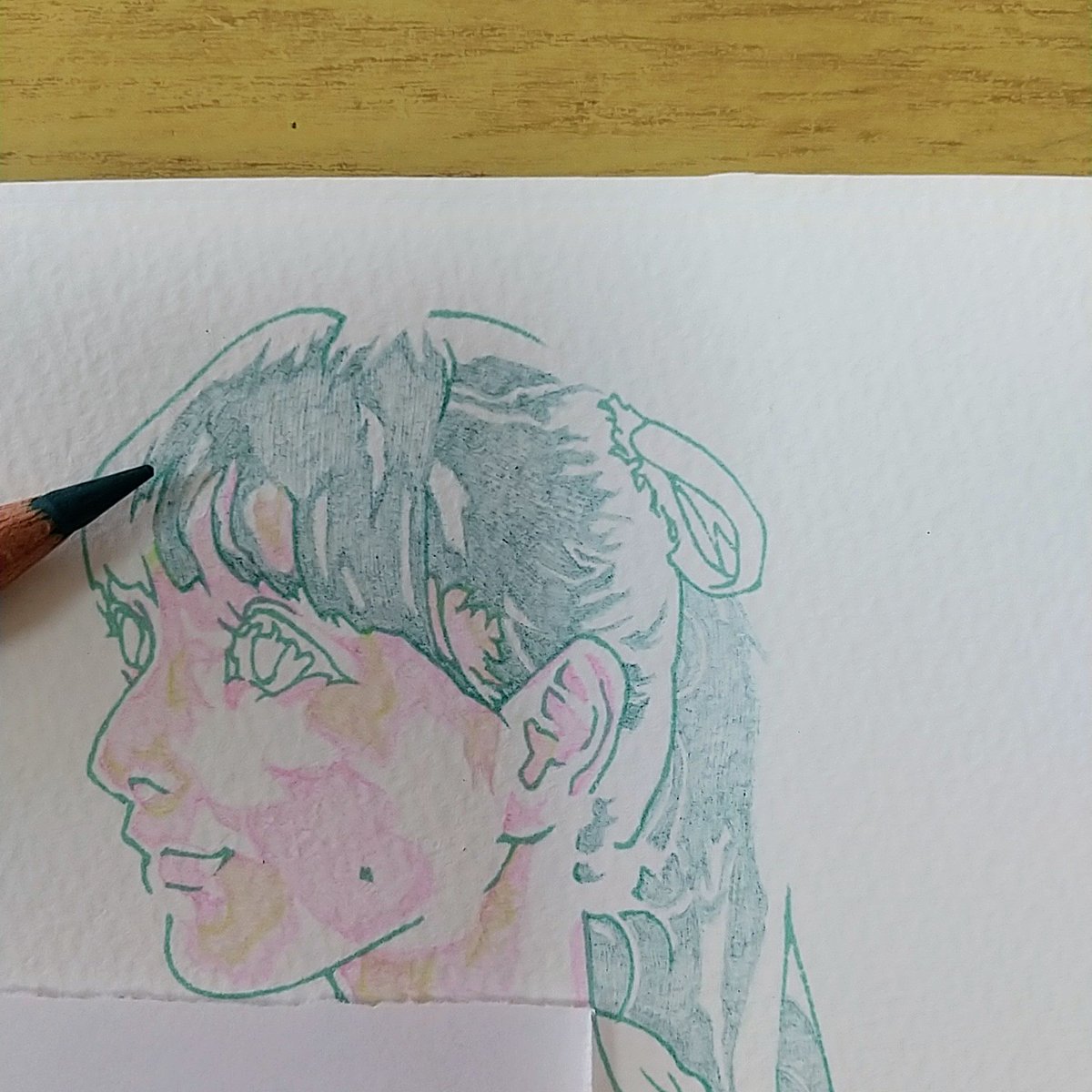 #火金お絵描き おはよう御座います🌞✨ るいちゃんの髪の毛の1段階目の陰を「Peacock Blue」で💡 逆光に輝く細い髪を描き込んだのが、龍氏的ガンバッッたポイントだから見てッッ(*`Д´)ノ❣️(笑) #おは戦40308mk🔥 #カムカムエヴリバディ #深津絵里 #似顔絵 #色鉛筆画