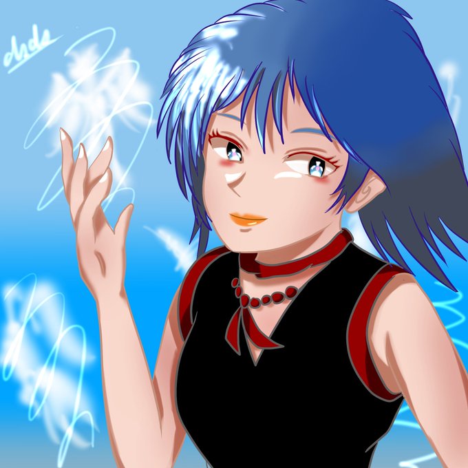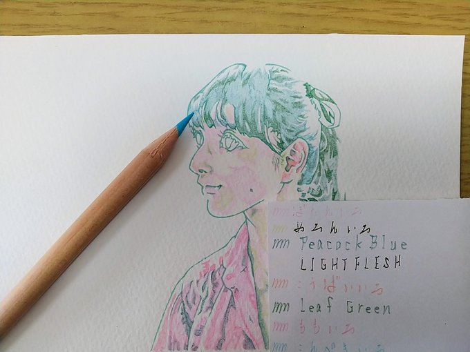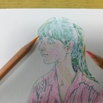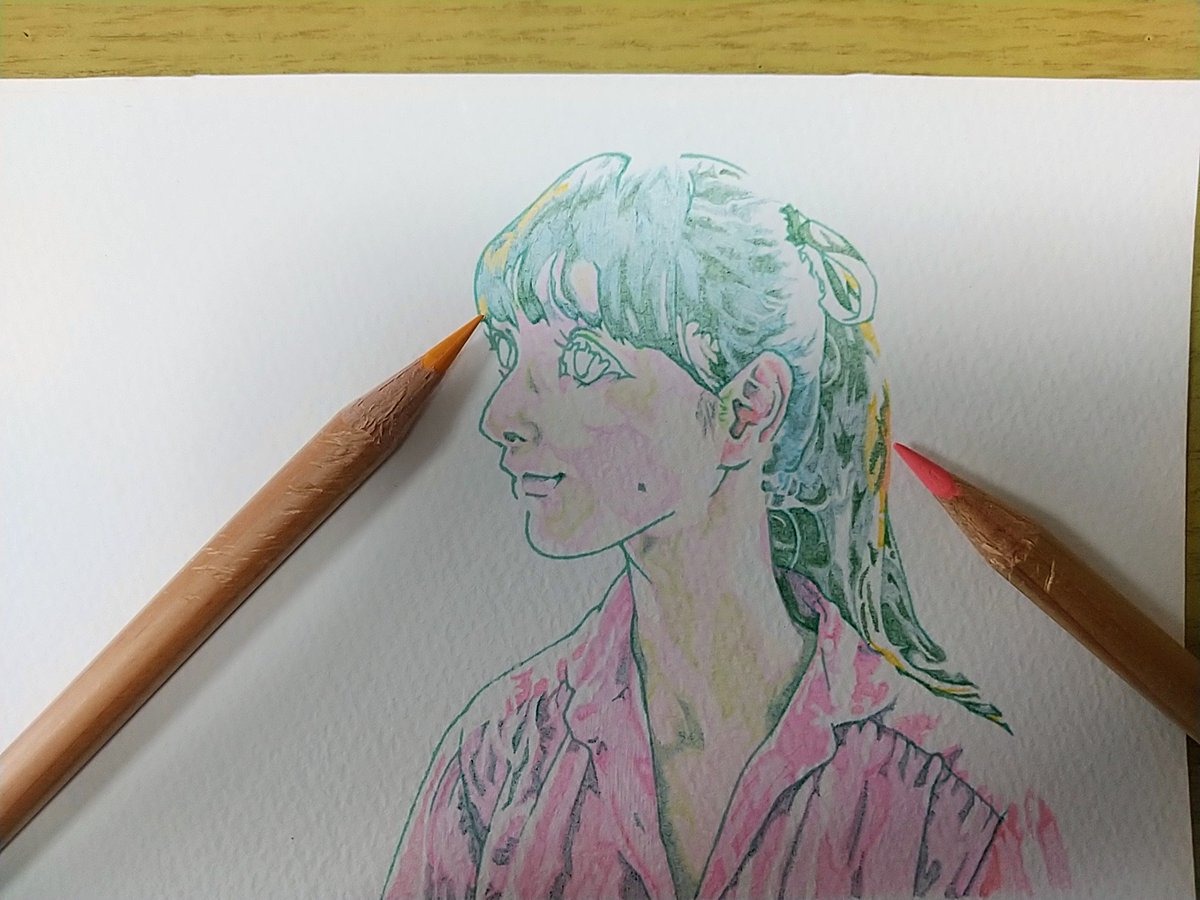 #火金お絵描き るいちゃんのサラッッサラ髪の毛を「Light Blue」と「Mandarin Orange」で塗りつぶし💡 ポニーテール部分には「こうばいいろ」でアクセント🌸✨ #おは戦40401ak🍺 #カムカムエヴリバディ #カムカム絵 #深津絵里 #似顔絵 #色鉛筆画