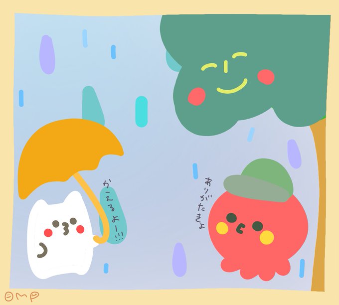 おはようございます☔ 雨宿りしてるたこちゃんを 迎えにきたスキスー 『一緒にかえろうっ』 本格的に梅雨が始まってきたので、 折り畳み傘などお忘れなく! 今日も良い日に🌈 #おは戦40514md #梅雨入り #イラスト #ゆるいイラスト #ゆるキャラ #ilustracion #雨