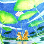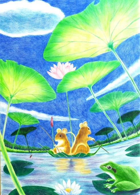 【イラストタイトル募集】 バスが茂る水面をネズミが水遊び。そんな時間を色鉛筆で描きました。作品タイトルが浮かばないのでタイトルを募集!いいアイディアあったらリプしてね😆 #イラスト #色鉛筆イラスト #おは戦41020om